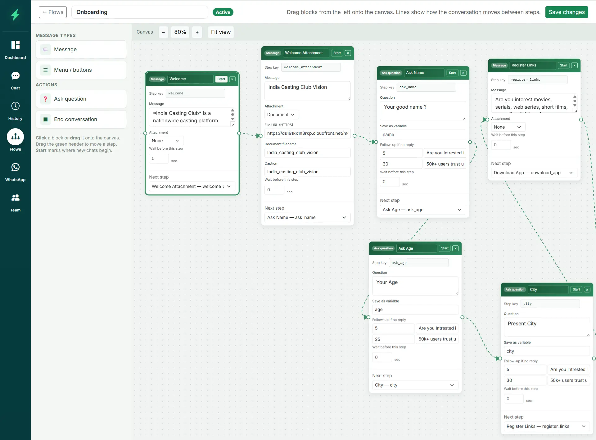 Message, input, options, and end steps with edges you draw on the canvas.