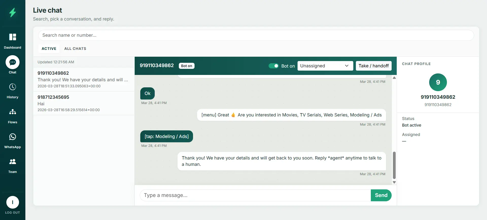 Toggle the bot off, take the thread, assign teammates, and keep full history in one inbox — so nothing falls through the cracks.